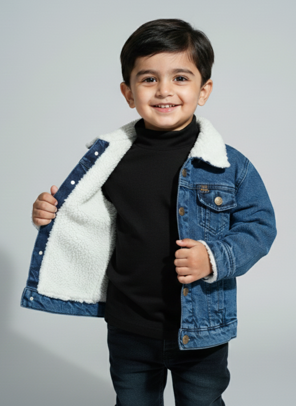 The perfect cold-weather staple: a classic blue denim trucker jacket fully lined with soft, plush sherpa fleece on the body and collar for ultimate warmth and style.