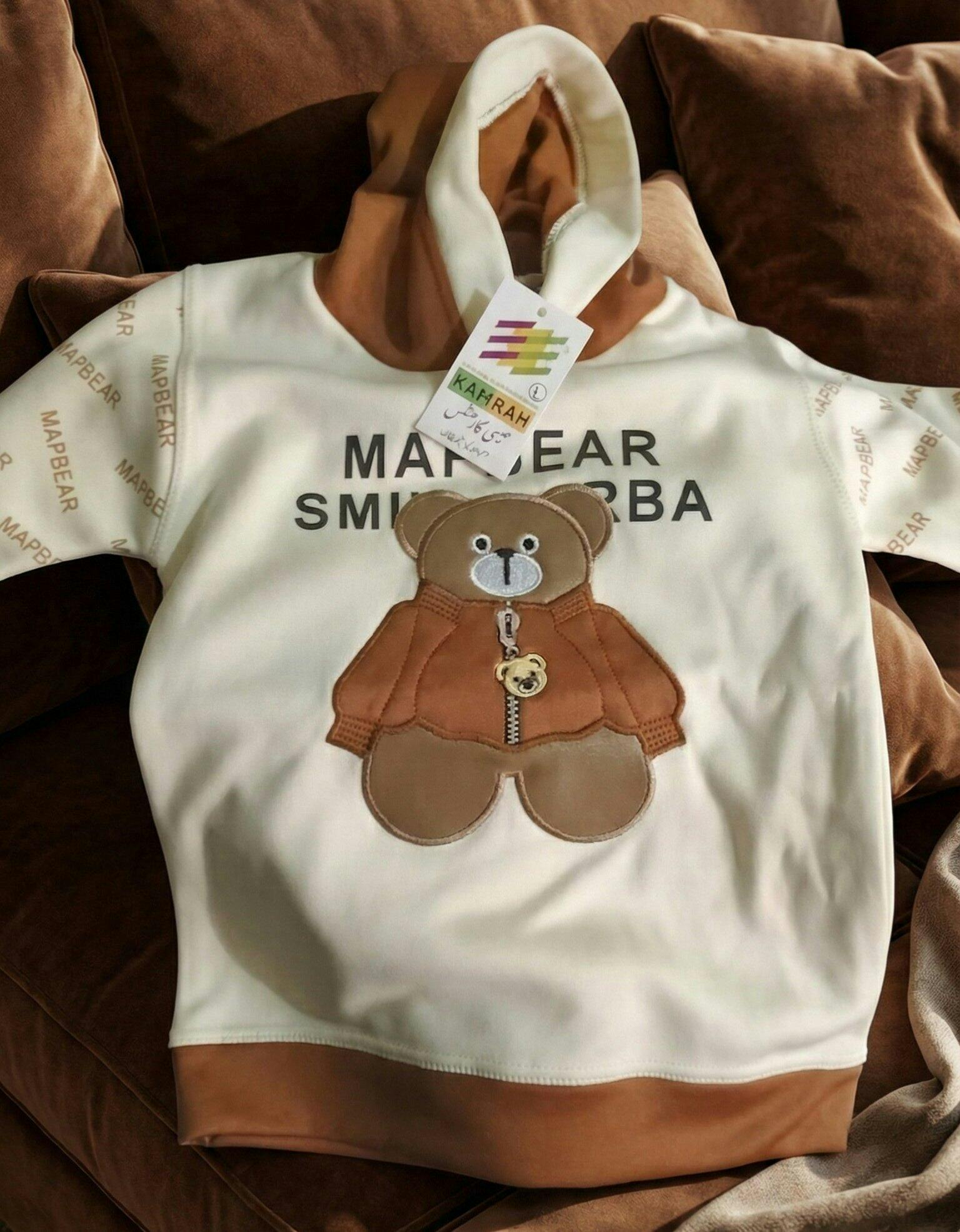 An ultra-cute and warm matching set featuring an off-white hoodie with an adorable appliqué bear graphic, paired with comfortable solid brown fleece joggers.